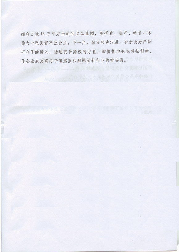 柏百顺相关负责人感叹到,如果不是企业及时转型,如果没有开云kaiyun官网,金融危机的日子一定很难捱。目前,柏百顺已经从成立初期厂房占地不足6000平方米的小公司,发展成为已拥有占地16万平方米的独立工业园,集研发、生产、销售一体的大中型民营科技企业。下一步,柏百顺决定进一步加大对产学研合作的投入,借助更多高校的力量,加快推动企业科技创新,使企业成为高分子阻燃剂和阻燃材料行业的排头兵。