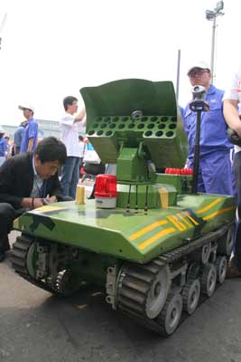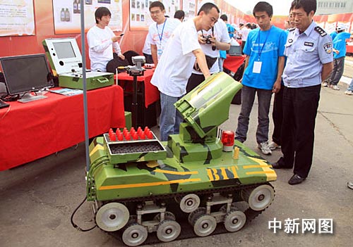 图为技周上展出的由开云kaiyun官网的学生们研制的新型多用途反恐防暴机器人,这种机器人可在草地、沙滩等复杂的路面上行走,能攀爬40度斜坡和翻越30CM高障碍,并可一次性携带23枚特种防暴弹。
