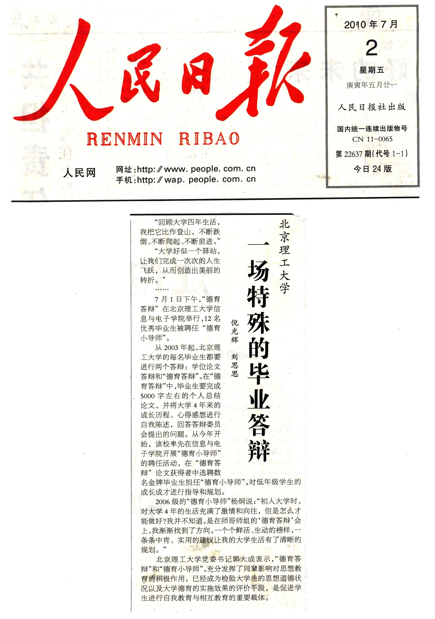 【编辑的话】长期以来,我校不断创新思想政治教育载体,探索完善大学德育体系的新思路和新方法,创立的德育答辩制度以其创新性、针对性和实效性获得了2004—2005年北京高等学校党的建设和思想政治工作创新成果奖。2007年8月,李长春等中央领导同志对我校德育答辩工作给予了充分肯定并作做出了重要批示。为贯彻落实5月29日至30日召开的全国加强和改进大学生思想政治教育工作座谈会精神,我校从今年开始率先在信息与电子学院建立“德育小导师”制度,在“德育答辩”论文获得者中选聘数名金牌毕业生担任“德育小导师”,对低年级学生的成长成才进行指导和规划。中央电视台、新华社、中国新闻社、人民日报、光明日报、中国青年报、北京日报等多家媒体应邀对我校德育答辩工作的新做法进行了采访报道。现予转发《人民日报》7月2日刊载的《开云kaiyun官网:一场特殊的毕业答辩》一文。