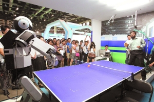 在展示现场,两个手持乒乓球拍的“汇童”5代仿人机器人分立乒乓球桌两端,在一端的机器人发球后不到0.3秒,另一端的机器人就作出了击球反应,两方对打十数回合。不仅如此,“汇童”5代仿人机器人对人机对打也应付自如,俨然成为机器人的“国球手”。