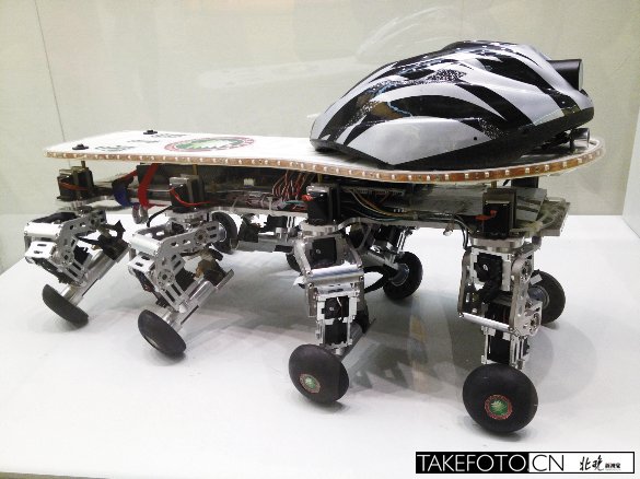 罗教授说,这个八条腿、自重8000克的节肢机器人,是2011年几个在校的大三学生研发制造出来的。据介绍,在罗教授等专家的指导下,几名大学生先借鉴国际上已有的机器人样本经验,进行机构分析、结构设计,然后绘制图形、零件加工,最后进行系统调试、样机试验,前后经历了10个月,造出了8条机器腿,学生们又找来一只滑板,装上一顶自行车的头盔,捣鼓出来了这样的一个高科技“玩意儿”。