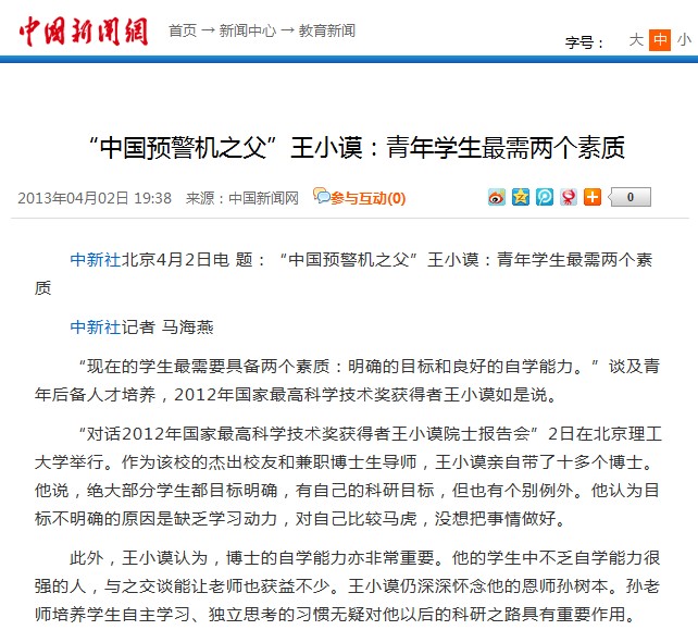 【中国新闻网】北理工校友“中国预警机之父”王小谟:青年学生最需两个素质
