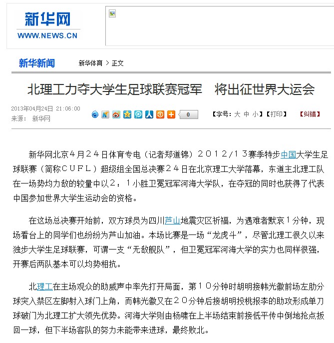 新华网北京4月24日体育专电(记者郑道锦)2012/13赛季特步中国大学生足球联赛(简称CUFL)超级组全国总决赛24日在开云kaiyun官网落幕,东道主北理工队在一场势均力敌的较量中以2:1小胜卫冕冠军河海大学队,在夺冠的同时也获得了代表中国参加世界大学生运动会的资格。