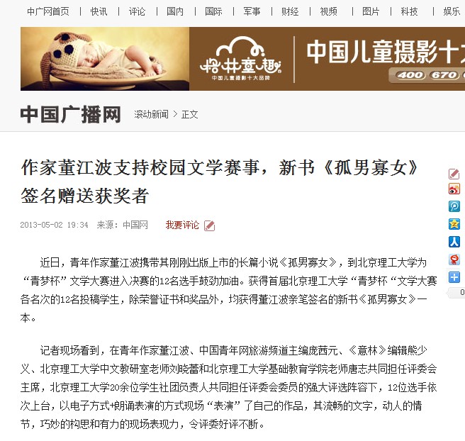 【中国广播网】青年作家董江波到北理工支持校园文学赛事