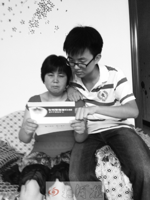 冯昊怡的母亲激动地看着儿子的录取通知书