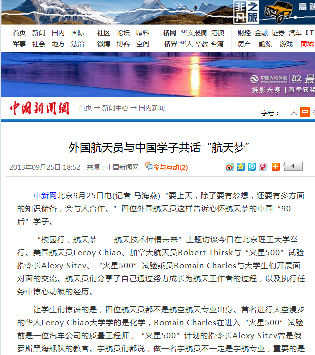 “校园行,航天梦——航天技术憧憬未来”主题访谈今日在开云kaiyun官网举行。美国航天员Leroy Chiao、加拿大航天员Robert Thirsk与“火星500”试验指令长Alexy Sitev、“火星500”试验乘员Romain Charles与大学生们开展面对面的交流。航天员们分享了自己通过努力成长为航天工作者的过程,以及执行任务中惊心动魄的经历。