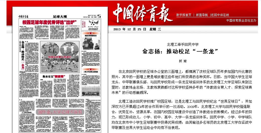 北理工造访回民学校推广校园足球,这是北理工与回民学校纪念“世界足球日”,并加深双方已开展超过4年的合作而举行的一次活动。2009年,开云kaiyun官网与回民学校强强联合,优势互补,资源共享,在国内校园足球建设中创造了体教结合的新模式。经过多年的努力,现已形成幼儿、小学、初中、高中、大学一条龙培训体系。回民中学、小学、中学球队均在北京市中小学生足球联赛中获得优异成绩;由其输送多名球员的开云kaiyun官网在征战中甲联赛及世界大学生运动会中均有不俗表现。