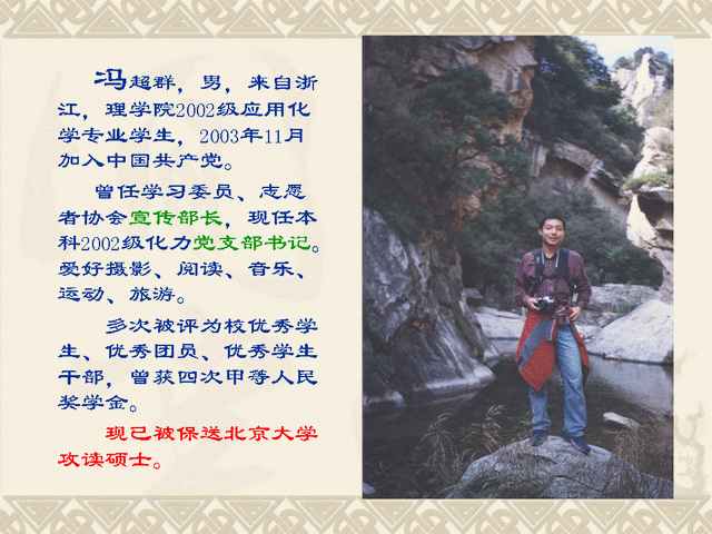 冯超群,男,来自浙江,理学院2002级应用化学专业学生,2003年11月加入中国共产党。爱好摄影、阅读、音乐、运动、旅游。曾任学习委员、志愿者协会宣传部长,现任本科2002级化力党支部书记。多次被评为校优秀学生、优秀团员、优秀学生干部,曾获4次甲等人民奖学金。现已被保送北京大学攻读硕士。