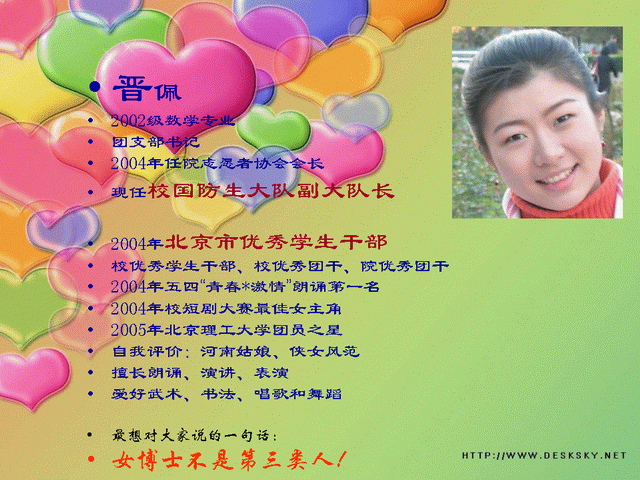 今天非常荣幸能够在这里和大家一起分享我大学生活的一些心情和感悟。近年来流行着一种说法,说世界上的人分三种:男人、女人、女博士,非常不幸,很快我就要落如女博士的行列了,还是学数学的女博士,这是不是比灭绝师太更灭绝师太啊?但我要大声说,女博士不是第三类人,更不是灭绝师太,我骄傲我是一名女博士!