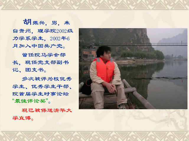 胡振兴,来自贵州,2002级力学系学生,2002年6月加入中国共产党。曾任马列主义学习会部长,现任党支部副书记、团支部书记。多次被评为校优秀学生、优秀学生干部,曾获理学院首届学生时事论坛“最佳评论奖”。现已被保送清华大学直博。