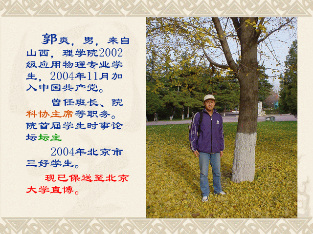 郭爽,男,来自山西,理学院2002级应用物理专业学生,2004年11月加入中国共产党。曾任院科技协会主席,马学会时事评论员、班长等职务。2004年被评为“北京市三好学生”。现已保送至北京大学物理学院直博。