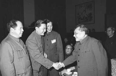 1983年10月29日,邓小平同志和新当选的全国总工会领导人倪志福、罗干、尉健行同志亲切握手。新华社发