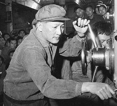 一九七七年十月,倪志福同志在北京内燃机总厂参加“群钻”操作表演。来自十多个省市的数百名刀具革新能手和金属切削的能工巧匠相聚北京,竞相传经献技。新华社发
