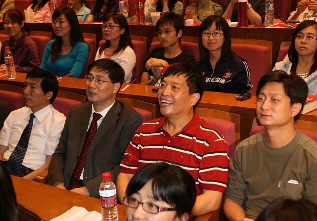 上午7:00,在中关村和良乡两个校区的24间教室和食堂里,技术人员正在反复的调试设备,将连接电视信号的线路接在位于讲台的操作台上,打开投影仪,看看声音大不大,试试图像清不清楚。