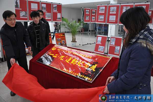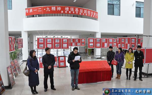 揭幕仪式之前,首先由基础教育学院副书记、副院长高伟涛致辞。高老师希望在新的历史时期,青年大学生能将爱国热情落实到自己的学习中,以实际行动为祖国的发展、学校的发展做出贡献。校团委副书记衡靖老师讲话:“基础教育学院文科学部通过开展纪念一二九运动的系列团日活动,充分调动起广大青年团员,重新认真的品读历史,加深了对于一二九精神的理解,也加深了对于青年学生特别是广大共青团员对于肩负的历史使命与社会责任的认识,对于我基础教育学院的团建工作具有重要的推动作用。”