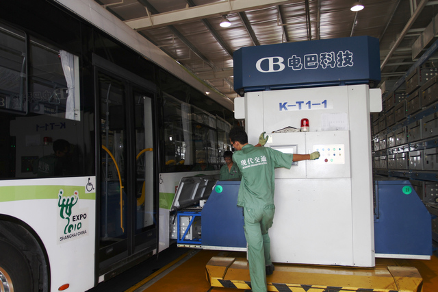 这批“零污染、无噪声”的纯电动客车,全部采用高能量锰酸锂电池供电,通过大功率电机驱动。为了保证电动车的顺利运营,世博园区内建成了世界上最大的纯电动客车充电站,每天为每辆电动客车更换2-3次电池。每当电池组电量低于20%时,便会发出警告,提示电动客车回充电站更换电池。