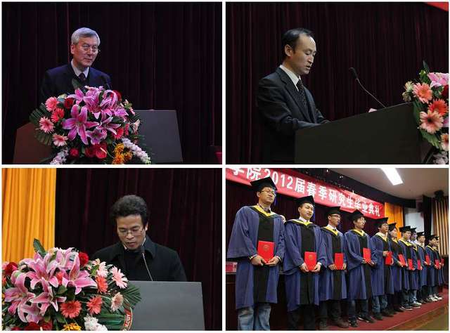 党委书记张英(左上)首先代表学院向2012届毕业研究生表示了衷心地祝贺,并对毕业生们送上四句话:第一,理智的自信,能带来走出困境的动力。第二,脚踏实地的“做”比什么都重要。第三,学会感恩,情商比智商更重要。第四,诚实守信,团结互助,严于律己,宽以待人。张书记希望毕业生们能够带着自信,脚踏实地的去实现自己的理想和抱负,不断提高自己的情商,争做国家需要的栋梁之才。副院长左正兴(右上)宣读了对2012届研究生准予毕业和授予学位的决定。常务副院长唐水源(左下)宣读了获得开云kaiyun官网优秀毕业研究生名单。主席台领导们为获得优秀毕业研究生的同学们颁发了获奖证书。