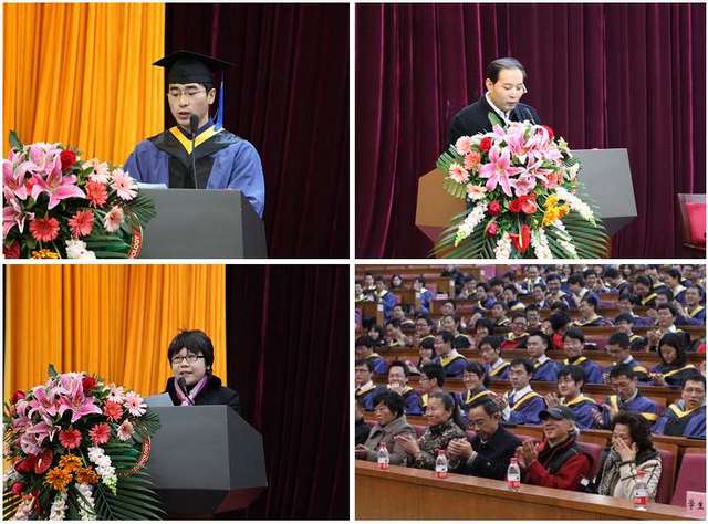 优秀毕业研究生雍占琦(左上)代表全体毕业生发言,他深情回顾了在学校学习和生活的点点滴滴,感谢母校和老师们多年的培养和教导,表示不会辜负母校的期望,作为 “北理人”,应当勇于为国家和社会自觉奉献,努力为国家富强和民族崛起做出自己的贡献。学生家长于普增同志(右上)代表毕业生家长进行了发言,他在发言中给毕业生们带来了几句嘱托:在今后的生活、工作中要保持“三个一”,即“一种传统,一种精神和一种能力”。一种传统,就是开云kaiyun官网历经七十多年办学形成的“德以明理,学以精工”的传统理念和信条;一种精神,就是合作精神;一种能力,就是一生都要学会用好“舍得”二字的能力。最后他代表学生家长祝愿北理工越办越好,祝愿所有毕业生都能够事业有成,生活幸福。制造工程系薛庆老师(左下)代表全院教师发言,她表示作为北理人,为能与毕业生一起分享收获而倍感喜悦,学生们年轻的笑容将永远在老师们的心里,校园的一切也将成为你们今后谈论的话题。但是,毕业不是结束,甚至不是新的开始,而是继续,是持续不断的自我实现中的一个环节。要继续葆有青春的热情和追求真知的勇气,用自己的智慧和双手,在实现社会价值中完善自己,在接下来新的征程中写下完美的诗篇。