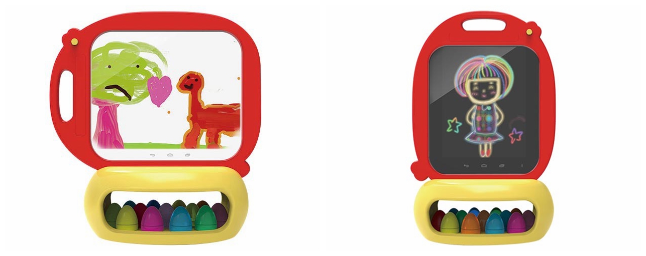 “Draw Pal”(绘画伙伴)在使用功能设计上也有很多值得称道的考虑,较好的满足产品不同的使用功能需要。Draw Pal画板分为纵向和横向两种摆放方式,底座上可设置磁性材料增强连接的稳定性;当画板横向插入底座时,可自动切换为充电模式,提升使用的方便性;画板的双向透明设计,旨在帮助儿童在涂鸦时可以看到彼此;画笔还可以吸附在画板的两侧,方便两个使用者共同完成画作。
