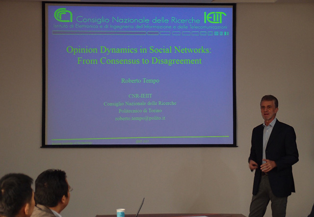 2015年11月3日,应“复杂系统智能控制与决策”国家重点实验室、自动化学院的邀请,世界著名控制理论专家、IEEE Fellow、 IFAC Fellow、IEEE Control System Society主席、Automatic主编、IEEE Transactions on Automatic Control高级编委、意大利都灵理工大学Roberto Tempo教授来我校访问交流,并作了题为“Opinion Dynamics in Social Networks: From Consensus to Disagreement”的精彩学术报告。自动化学院多名师生认真听取了报告,并进行了热烈的交流讨论。