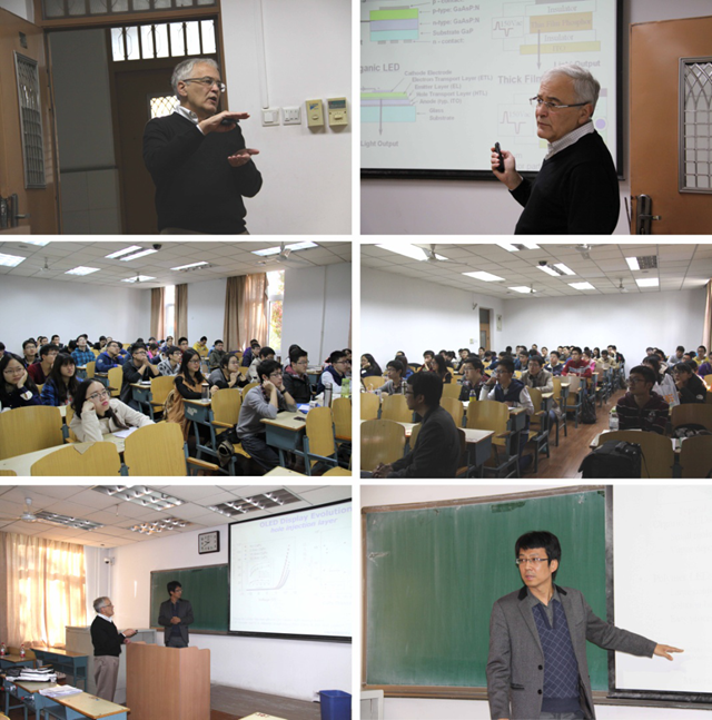 在访问期间,葛内德副校长及随行助手贾会平研究员在3号楼302教室为光电学院光电信息工程专业本科四年级同学讲授了《光电显示技术》课程中的《OLED显示技术》部分。学生们认为葛内德教授上课充满激情,诙谐生动,讲课内容丰富,当学生们了解到OLED显示技术发展奠基人邓青云博士为华人时,学生产生了极大的自豪感。贾会平研究员和唐义副教授对课件的关键词语进行了中文对照,并就课程中的部分难点和重点问题进行翻译和解释。