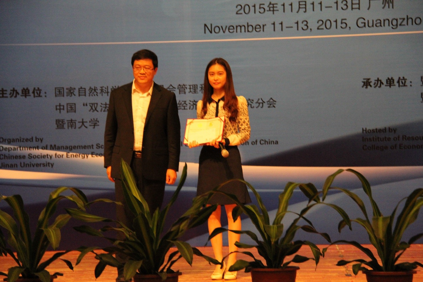 在日前结束的第六届中国能源经济与管理学术年会上,能源与环境政策研究中心周慧羚同学获中国能源经济与管理优秀研究生论文一等奖,其报告的论文题目是“Investment Opportunities in China’s Overseas Oil Projects: An Real Option Approach and its Application”。此外,能源与环境政策研究中心李奕同学获得三等奖。