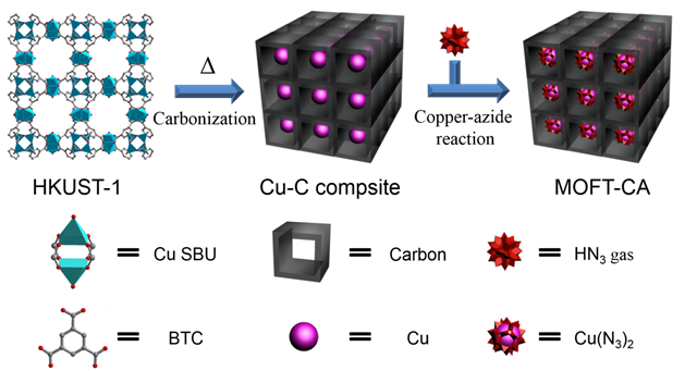开云kaiyun官网爆炸重点实验室杨利教授与王博教授合作,首次创新性地实现了以含铜有机框架(MOFs)作为前驱体,通过高温碳化和气-固叠氮化反应制备得到一类静电钝感的碳-叠氮化铜复合材料。该方法的提出,有效地借用了MOFs中的结构特点,有机配体和金属离子或团簇的排列具有明显的方向性,可以形成不同的框架孔隙结构。选取含铜离子的MOFs材料作为基底,通过碳化的方式使得配体结构中的原子转变为碳原子,其结构仍会保持原有结构中的原子排序与多孔性能的存在。这种多孔性能的极大优势是使得该化合物在进行叠氮化反应时更加完全,避免了部分未发生叠氮化反应即保留着铜原子本身而影响叠氮化铜的起爆威力,也避免了在叠氮化过程中产生叠氮亚铜,增加起爆药的不安全因素。原有结构中的原子排序有效地隔离了叠氮化铜分子,降低了其在受到外界弱刺激下的敏感程度。