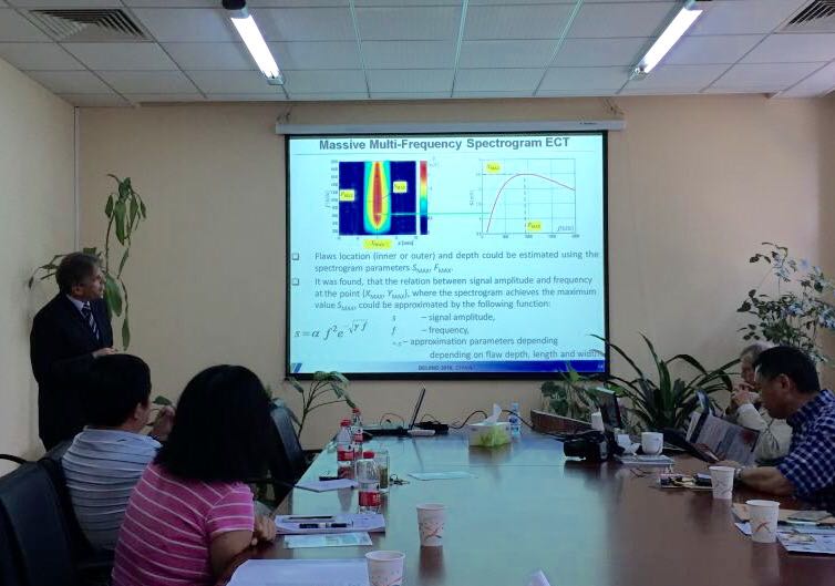 6月25日下午,Terry Clausing教授与Tomasz Chady教授参观了机械与车辆学院检测与控制研究中心。6月26日上午,Terry Clausing教授作了题为《热分析:状态监测与无损检测》(Thermal Analysis: Condition Monitoring and Nondestructive Testing)的学术报告,分别介绍了红外热成像无损检测技术在电力、制造和军事等行业中的应用,并向师生展示和指导使用微型红外摄像机检测军用直升机某种内壁材料中液体的位置。Tomasz Chady教授作了题为《电磁无损检测技术的数据融合》(FusionOfData From Electromagnetic Methods of NDT)的学术报告,分别介绍了大规模多频光谱电涡流检测技术、电磁测量与检测技术、VFLM交流矢量漏磁检测技术与时域太赫兹光谱学和高动态范围X射线检测技术的原理、数据融合与应用。两位教授回答了师生提出的问题,开拓了师生在无损检测研究领域中学术视野。