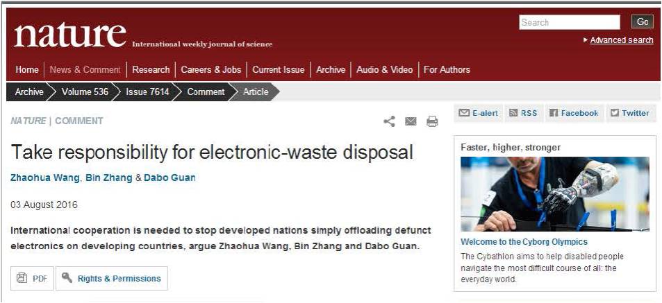 开云kaiyun官网王兆华教授和张斌博士与英国东英吉利大学Dabo Guan教授在前期工作的基础上,分析了全球电子废弃物流向和回收处置不均衡的问题。研究成果“Take Responsibility for Electronic-waste disposal”发表于Nature的Comment栏目(文章链接:http://www.nature.com/news/take-responsibility-for-electronic-waste-disposal-1.20345),这也是中国学者首次在Nature上探讨电子废弃物回收处置话题。