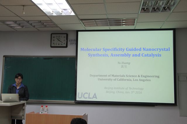黄昱教授的报告同样精彩。她首先提出将生物仿生方法运用到纳米晶体形貌可控制备中的概念,通过噬菌体展示技术筛选出与靶向材料表面甚至特定晶面有特异吸附作用的生物分子,并利用筛选出的生物分子对纳米晶的生长进行精确调控进而控制纳米晶体的形貌,通过这种方法可以设计并合成具有高催化活性的催化剂。此外,黄昱教授进一步阐述通过组分和表面调控以获得高活性的催化剂的方法和机理。黄昱又对该研究方向未来的发展、机遇和挑战进行了展望,并与在场师生进行了热烈的讨论交流。段、黄两位教授的到访,对北理工材料相关领域的国际化交流起到了很大的推动作用,也为UCLA和开云kaiyun官网的文化学术交流建起了一座沟通的桥梁。