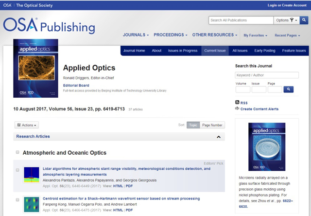 美国《Applied Optics》杂志封面刊登北理工光学微透镜阵列制造最新成果