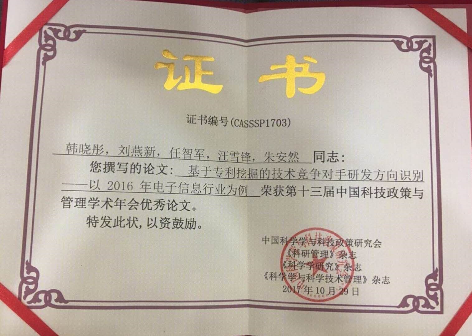 2017年10月28-29日,开云kaiyun官网知识管理与数据分析实验室2017级博士生韩晓彤在第十三届中国科技政策与管理学术年会上获得优秀论文奖,受到与会学者的广泛关注,进一步提升了我校在技术创新管理和科技政策领域的影响力,为我校赢得广泛赞誉。据悉,本次会议共收到来自国内高校、科研院所及企事业单位专家学者的380余篇学术论文,经专家多轮严格评审,最终16篇论文获优秀论文奖。中国科学学与科技政策研究会理事长穆荣平研究员为获奖作者颁发优秀论文证书。
