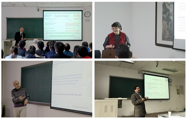 法国里尔大学的Bourbigot教授和Jimenez教授、德国弗劳恩霍夫研究院的Döring教授、英国博尔顿大学的Kandola教授、印度乌特卡尔大学的Sahoo教授、美国佐治亚大学的Yang教授、瑞士国家实验室的Gaan教授、西班牙加泰罗尼亚理工大学的Haurie教授、美国纽约州立大学石溪分校的Rafailovich教授、都灵理工大学Giovanni Camino教授和Alberto Frache教授等诸多阻燃领域国际知名教授,举办了系列讲座二十场,从多个角度对新型阻燃剂设计、膨胀阻燃新概念、纳米阻燃新趋势、聚合物阻燃关键技术、阻燃防火评价方法等阻燃领域的重要问题进行了分析探讨,和我校师生开展了热烈深入的讨论交流,对我校阻燃领域今后的研究开拓了新的思路、新的方向。