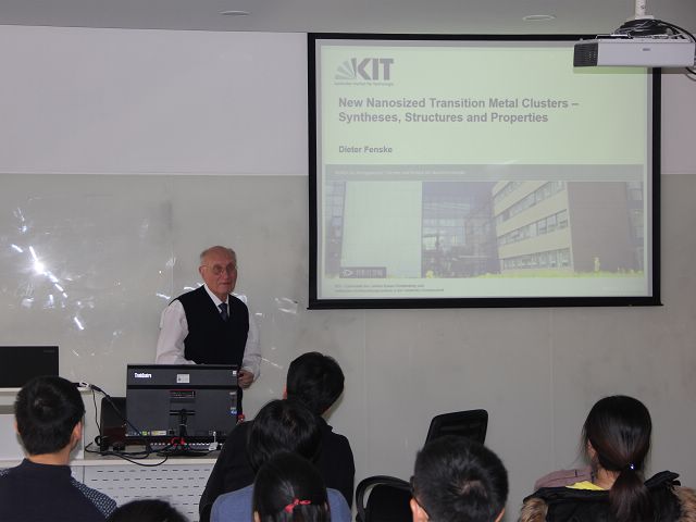 11月28日下午,Dieter Fenske教授在研究生楼5层东侧报告厅做了学术报告,在介绍了德国Karlsruhe Institute of Technology (KIT)的材料、化学学科建设基础上,介绍了他本人课题组在过渡金属原子簇化合物,主族金属元素簇合物与纳米级团簇化合物从精确解析簇合物晶体结构角度的研究。Dieter Fenske教授所研究的有关金属簇合物的原创性成果得到了世界上众多同行的认可,产生了深远的影响,发表Angew. Chem. Int. Ed.、Adv.Mater.等论文490余篇。报告深入浅出,大家争相提问,现场气氛热烈,讲座在大家的欲犹未尽中结束。会后与学院的青年教师李霄羽教授、李红博教授等进行了深入的学术讨论。