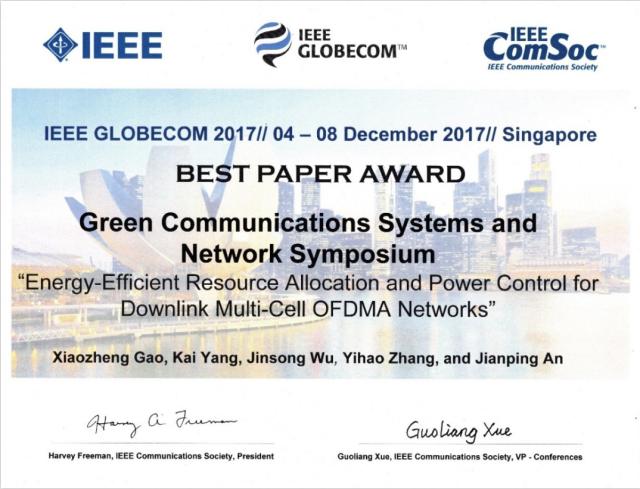 IEEE GLOBECOM是世界通信行业的两大顶级会议之一,是世界通信行业规模最大、最具影响力的标志性学术会议,于每年12月中旬定期召开。会议涵盖了信息论、认知无线电技术、网络安全、无线通信网络、光通信网络、大数据、云计算、绿色通信、物联网等在内的通信行业的各个领域。IEEE GLOBECOM的最佳论文奖是通信学术界的顶级大奖之一,该奖项长期被欧美顶尖学府垄断。本次大会从2600余篇投稿中,根据研究领域评选出了15篇最佳论文,安建平教授团队的论文获得了绿色通信系统与网络唯一的最佳论文奖,这是我校首次获此殊荣。
