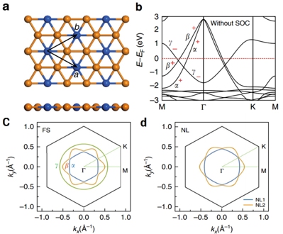 (a) 结构俯视和测视图,橘黄色表示Cu原子,蓝色表示Si原子;(b) 第一性原理计算的能带结构图,不考虑自旋轨道耦合效应;(c) 费米面分布图 (d) 动量空间中狄拉克节线分布图
