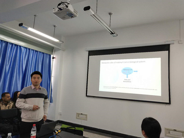 李春为大家介绍了Yajun Yan副教授的学习与工作经历;Yan教授简要介绍了他的代谢工程与合成生物学方向的研究进展情况。