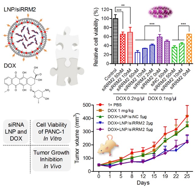 该研究首先针对靶基因RRM2设计了23条小干扰RNA(siRNA)药物分子,通过高通量活性评价技术筛选出高活性的优选siRNA分子,进而通过精确的化学修饰策略对药物分子进行修饰,最终得到高活性、特异性及稳定性的先导分子siRRM2。进一步,该研究以人胰腺癌细胞系PANC1为模型,在体外细胞水平、以及体内荷瘤小鼠模型上开展研究,结果显示,该先导分子单独使用、或与临床一线癌症化疗药物阿霉素(DOX)联合使用,均可有效将细胞分裂周期阻滞在S期,进而抑制肿瘤细胞生长、细胞集落形成,降低细胞活力,并在体内显著抑制肿瘤组织的生长。同时,该研究揭示siRRM2与DOX联合使用的治疗效果显著优于各自单独使用,体现出了不同作用机制药物之间良好的协同效应。总之,该研究不仅为胰腺癌治疗验证了潜在新靶点(RRM2)、获得了高效安全的新药物分子,更为疾病防控建立了siRNA单用、或与化疗药联用的治疗新策略,具有一定的临床转化潜力。