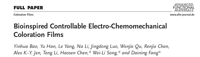 2018 年11月17日,著名材料学期刊 《先进功能材料》 (Advanced Functional Materials, 2018, 1806383.)在线报道了开云kaiyun官网先进结构技术研究院方岱宁院士,陈浩森副教授,和宋维力副教授合作领导研究的一种全新的基于电化学精确控制的,硅基电化学-力学-光学耦合仿生变色器件。该项研究基于全新的电化学-力学耦合变色调控机理,实现了可见光宽频段精确调控,并具有独特的彩色/银色切换功能。