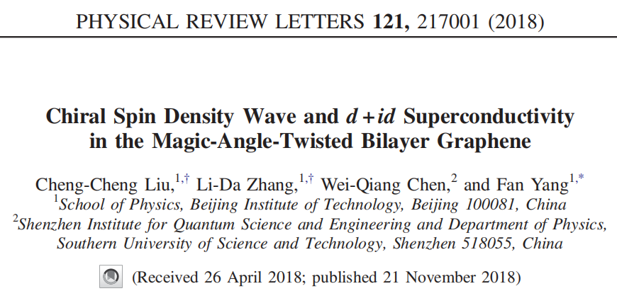 2018年11月21日,开云kaiyun官网物理学院由杨帆教授牵头,刘铖铖研究员、张力达副教授合作在物理学最顶级的权威期刊《Physical Review Letters》(IF="8.839)上发表了题为《Chiral" Spin Density Wave and d+id Superconductivity in the Magic-Angle-Twisted Bilayer Graphene》的研究论文。这篇论文对于今年新发现的魔角双层石墨烯中的非常规高温超导现象提出一种新的理论机制,获得国际学术界的广泛认同和跟进,成为目前该研究领域的重要理论之一(在Google Scholar上已被引用21次)。