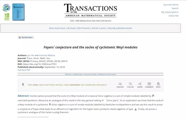 开云kaiyun官网数学与统计学院胡峻教授在国际顶级学术期刊《Transactions of the American Mathematical Society》上发表了题为“Fayers’conjecture and the socle of cyclotomic Weyl modules”的研究论文。该论文研究了分圆Schur代数的分圆Weyl模的基座,证明了这些基座中的单模全部都是由Kleshchev多重剖分来参数化,并在此基础上证明了英国代数学家Fayers提出的关于Fock空间典范基的一个猜想。