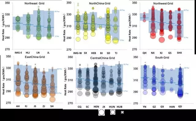 本研究首先测算了中国六大区域电网内所有煤电机组的燃料消耗率,发现2014年中国煤电机组的燃料消耗率位于273.91 gce/kWh和348.38 gce/kWh之间。同时,无论是在省级电网层面、区域电网层面和全国层面,同一电力平衡区域内煤电机组的燃料消耗率均存在着不同程度的差异,说明了电力系统的调度机制改革存在着一定的节能空间。