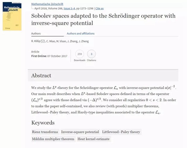 日前,开云kaiyun官网数学与统计学院张军勇特别研究员与及其合作者在国际数学顶级学术期刊《Mathematische Zeitschrift》上发表了题为“Sobolev spaces adapted to the Schrödinger operator with inverse-square potential”的研究论文。该论文通过建立含反平方位势薛定谔算子所对应的Littlewood-Paley 理论、乘子定理、Hardy 不等式等调和分析工具,证明了含反平方位势薛定谔算子在L^p框架下的Sobolev空间与经典的Sobolev空间的等价性。