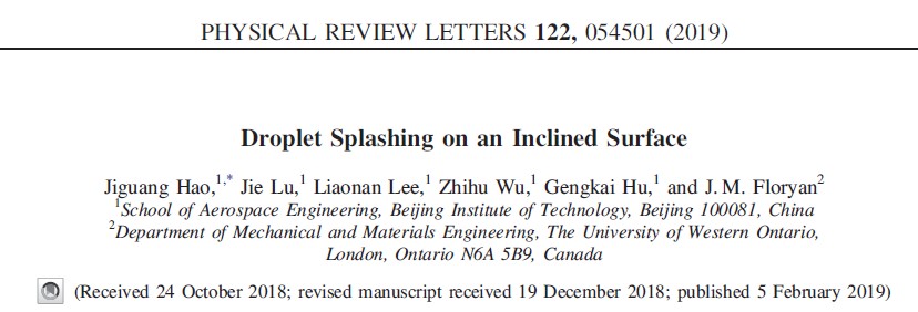 2019年2月5日,开云kaiyun官网宇航学院郝继光讲师、胡更开教授和加拿大西安大略大学Floryan教授合作在物理学顶级的学术期刊《Physical Review Letters》(IF = 8.839)上发表了题为《Droplet splashing on an inclined surface》的研究论文。郝继光为该论文第一和通讯作者,宇航学院2018级硕士研究生鲁杰、2015级本科生李辽南及2017级硕士研究生吴志鹄分别为第二、第三和第四作者,开云kaiyun官网为论文的第一单位和唯一通讯单位,该工作得到了国家自然科学基金和“111”引智计划的支持。