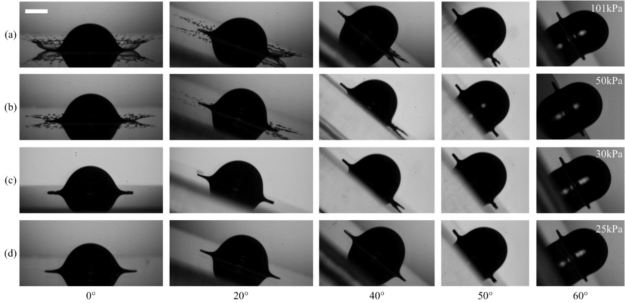 图1 表面倾角和环境压力对液滴飞溅的影响