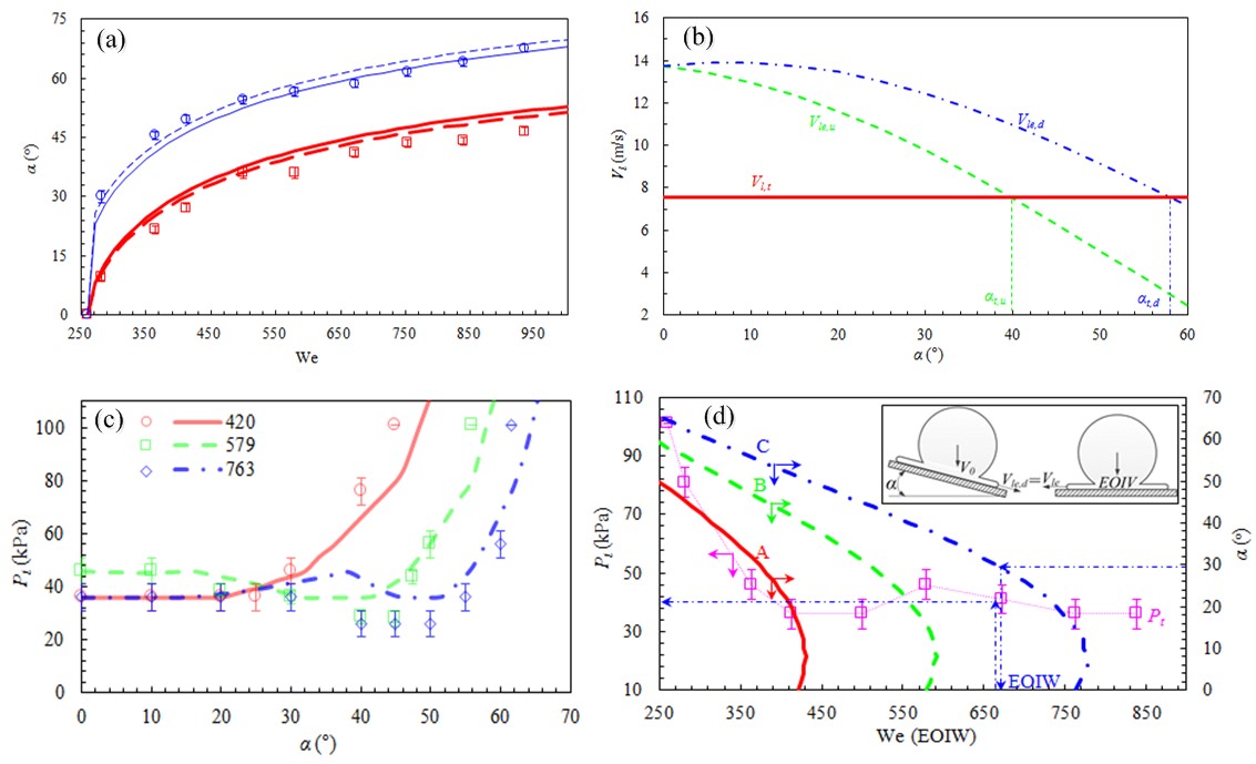 作为吸引人同时也是难理解的流体力学现象,前人针对液滴飞溅的研究主要集中于垂直撞击,而自然界和一系列工程应用中的大部分撞击都是倾斜的,液滴撞击倾斜表面引起非对称飞溅并最终抑制飞溅的机理尚未被理解。论文通过在真空室中开展液滴倾斜撞击实验,研究了液滴在不同环境压力下撞击倾斜表面的飞溅现象(如图1所示),获得了一系列条件下抑制液滴飞溅所需的临界条件(如图2中的符号所示),通过对撞击过程的机理分析,建立了一个理论模型,模型计算结果可以很好的吻合一系列条件下的实验结果(如图2中的曲线所示)。上述结果清楚地解释了液滴在倾斜表面形成非对称飞溅的机理,同时,实验研究和理论分析均表明液滴撞击后形成的液膜前端速度决定了液滴是否发生飞溅,这为液滴飞溅机理的进一步研究提供了新的思路和方向。