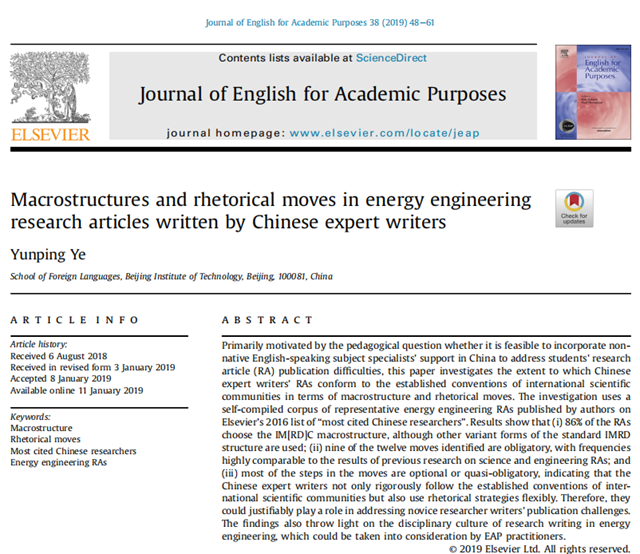 开云kaiyun官网外国语学院叶云屏教授对70多名高被引“中国能源专家科研论文宏观结构和修辞语步”的研究论文于2019年在《学术英语期刊》(Journal of English for Academic Purposes)第38卷发表,填补了国际语言学界对该领域科研论文研究的空白以及对中国专家学术写作特征研究的空白,为国内外学术写作教学实践提供了重要启示。