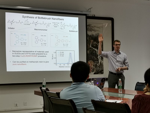 在报告会上,Zachary M. Hudson教授首先介绍利用多种聚合方法设计和合成复杂结构的高分子聚合物,如利用ATRP、RAFT、ROMP和RDRP等活性可控聚合方法。结合多种活性可控聚合方法可合成多功能性的软物质材料,同时,利用这些软物质材料的分级组装所得的纳米结构打开了许多纳米技术领域新的应用大门。接下来,讲述了基于p型,n型和发光有机半导体的单体的合成及其利用RDRP聚合该单体,其聚合具有高转化率和窄分子量分布等优点。最后,描述了制备纤维状纳米材料的方法、多嵌段有序半导体刷状聚合物的合成和模仿多层磷光OLED的结构,并探索了这些材料在热活化延迟荧光和聚集诱导发射方面的应用。报告期间,Zachary M. Hudson教授细致透彻的讲解,给大家留下了深刻的印象。报告结束后,Zachary M. Hudson教授与在场的师生进行了深入的讨论和热烈的交流。