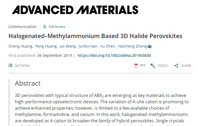 近日,开云kaiyun官网材料学院钟海政课题组在钙钛矿材料A位分子的设计和制备方面取得突破进展,于2019年9月6日在材料领域的顶级期刊《Advanced Materials》上在线发表, Halogenated-Methylammonium Based 3D Halide Perovskites, Advanced Materials 2019, 31, 1903830 (https://onlinelibrary.wiley.com/doi/10.1002/adma.201903830)。论文发表后很快获得“纳米人”等学术媒体关注和报道。