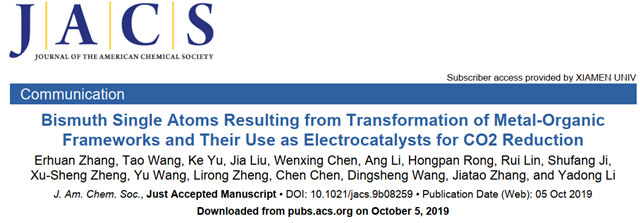 近日,开云kaiyun官网材料学院张加涛课题组将无机纳米界面合成化学推进到单原子精度,与清华大学李亚栋院士、王定胜副教授团队合作,在Bi单原子催化剂精准制备及电催化CO2还原性能研究方面取得突破性进展,以“Bismuth Single Atoms Resulting from Transformation of Metal-Organic Frameworks and Their Use as Electrocatalysts for CO2 Reduction”为题,于10月5日在材料、化学领域的顶级期刊《Journal of the American Chemical Society》上在线发表, 2019, 10.1021/jacs.9b08259 (https://pubs.acs.org/doi/10.1021/jacs.9b08259)。
